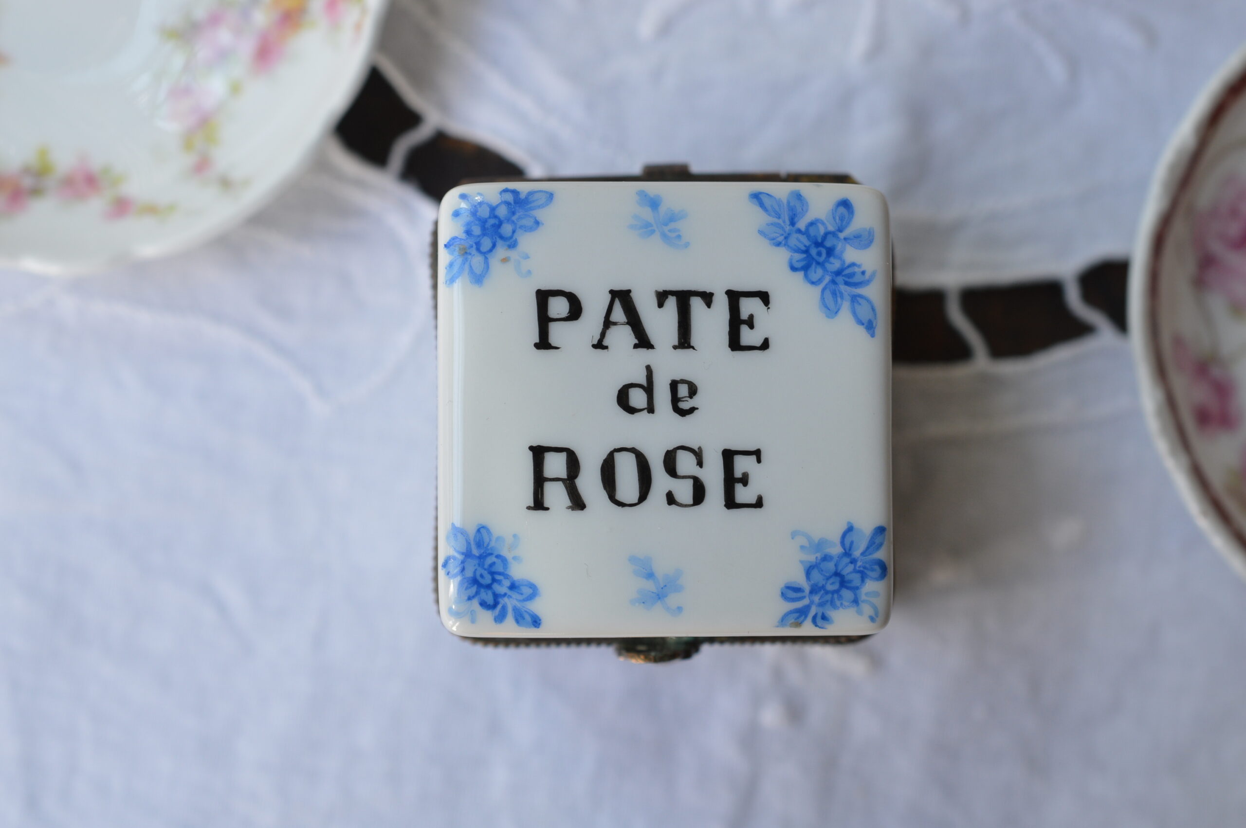 PATE de ROSE トリンケットボックス(小物入れ) ホワイト地に青いバラの模様。「PATE でROSE…