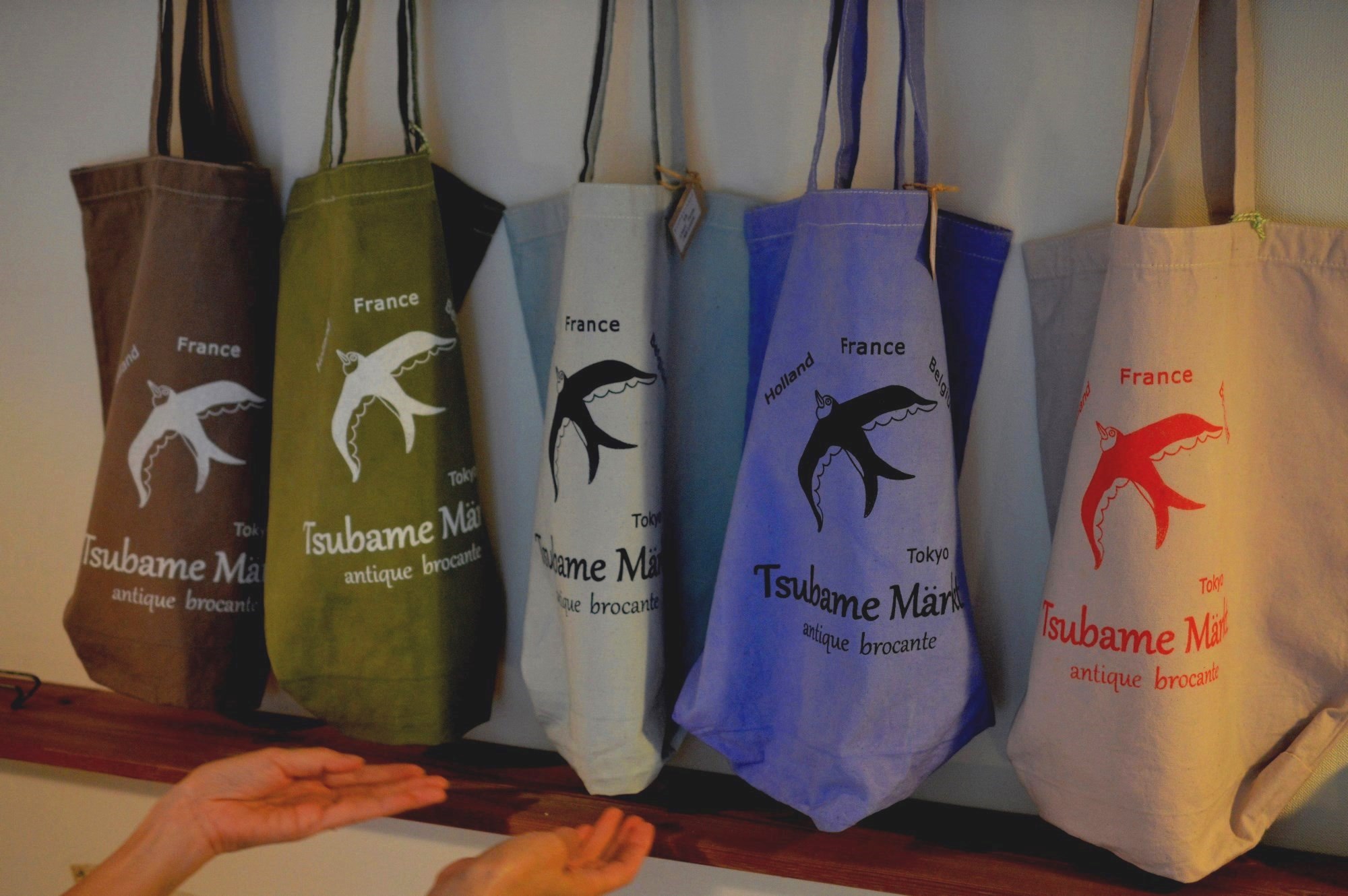ツバメ・マルクト オリジナルのトートバッグを制作しました。生成りと5色の手染めの2種類を作りました。生地はどち…
